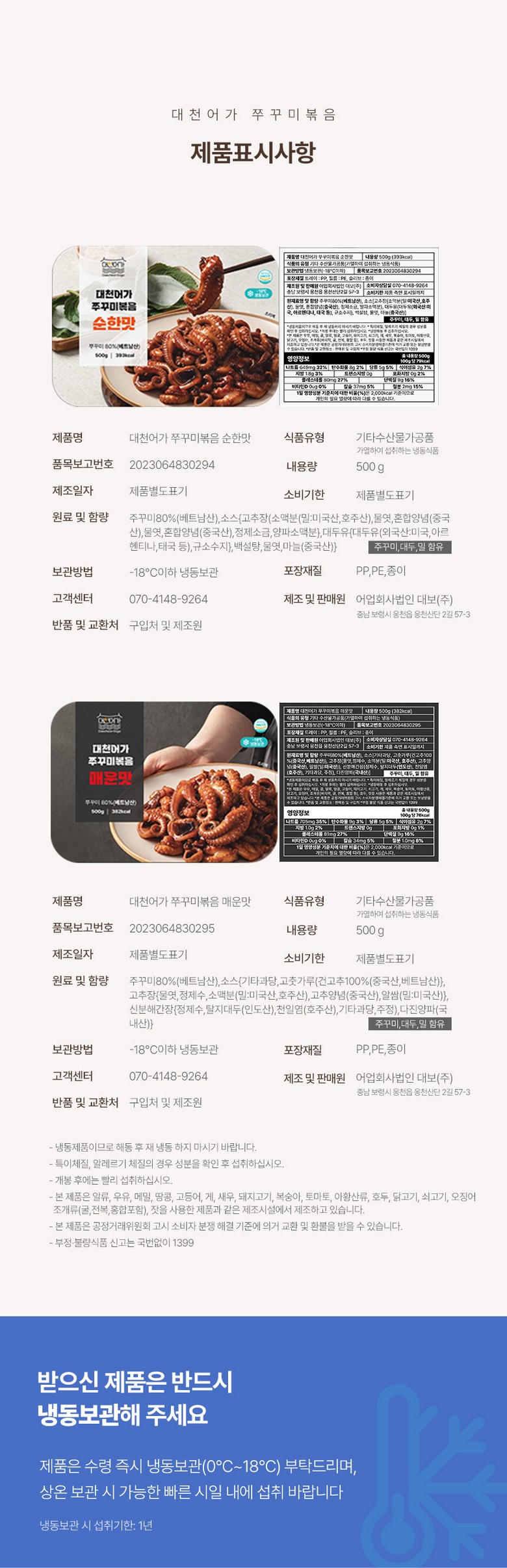 | 생산자 및 소재지 | 어업회사법인 대보(주)/충남 보령시 웅천읍 웅천산단2길 57-3 | 제조연월일, 소비기한 또는 품질유지기한 | 제조일로부터 12개월 |