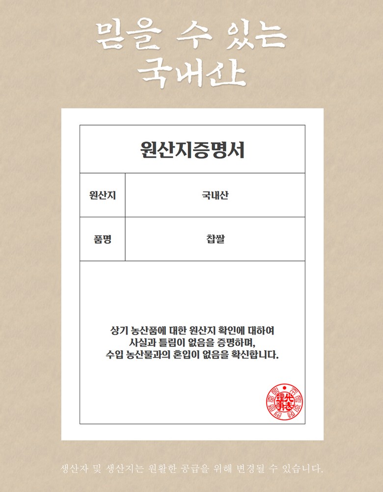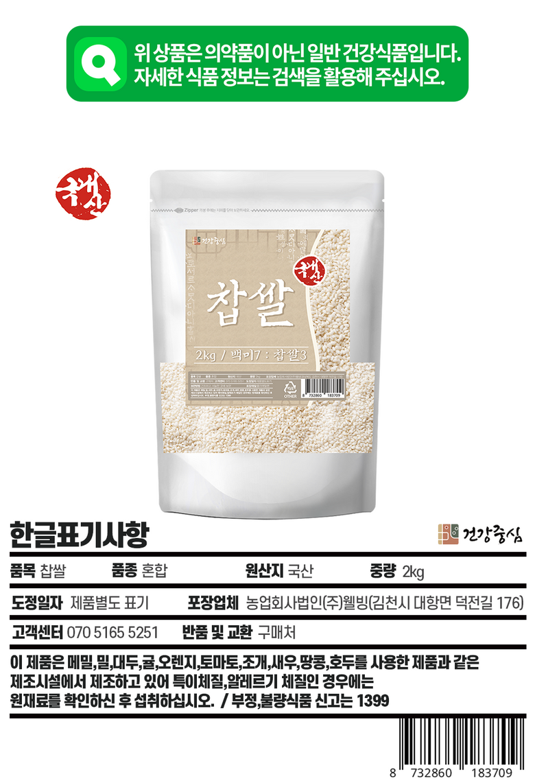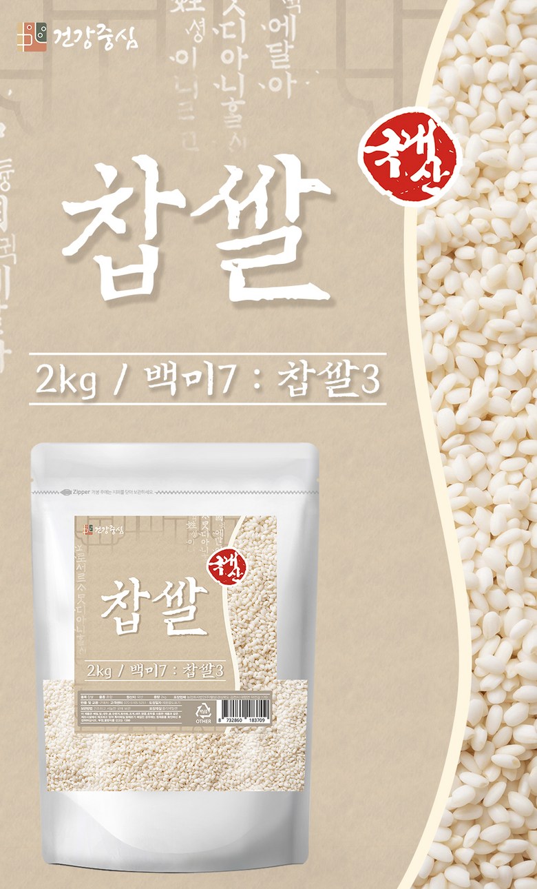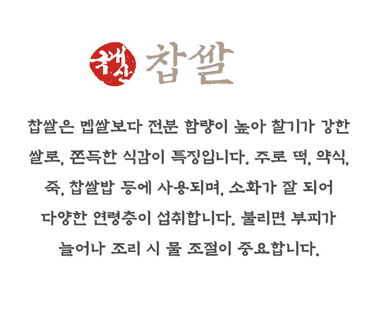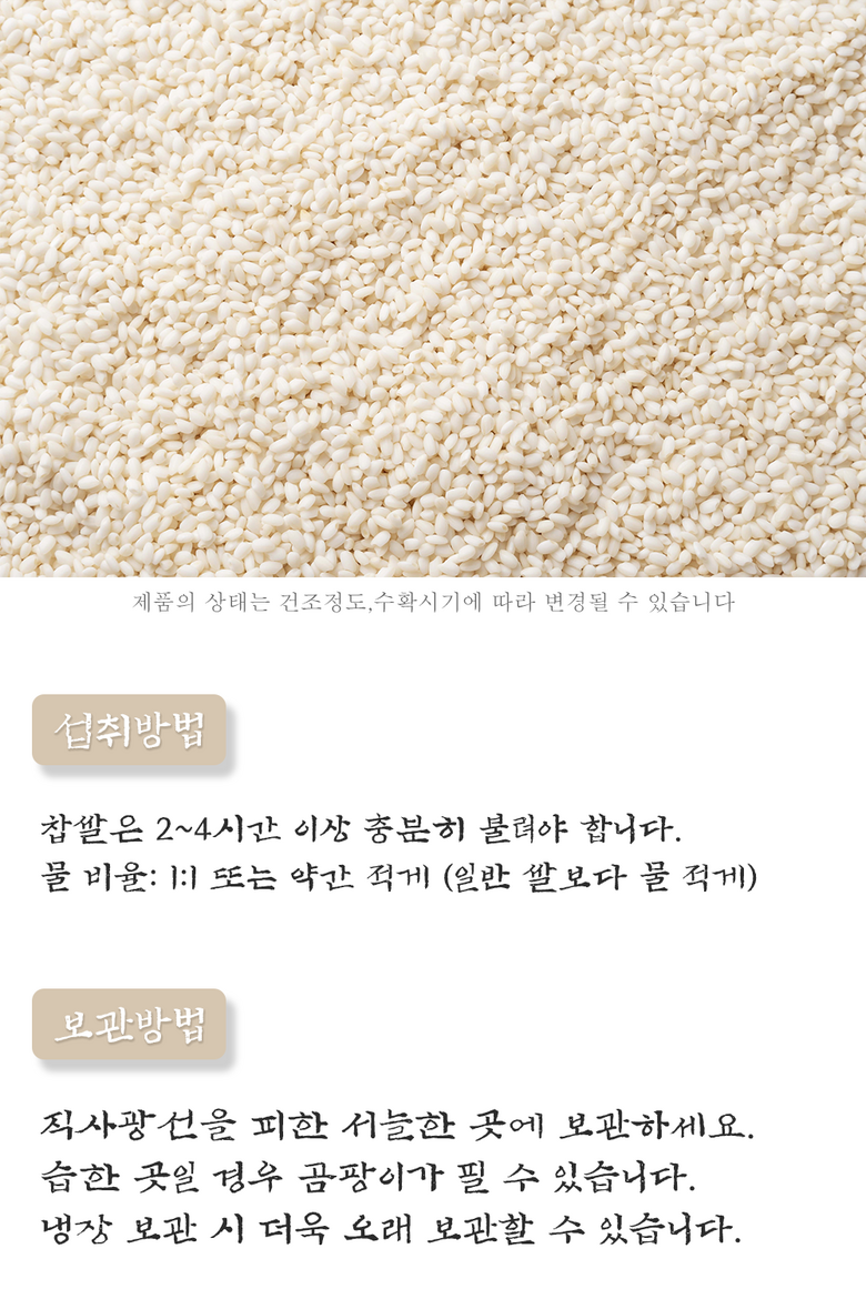 | 품목 또는 명칭 | 찹쌀 | 포장단위별 내용물의 용량(중량),수량,크기 | 상품 상세페이지 참조 |