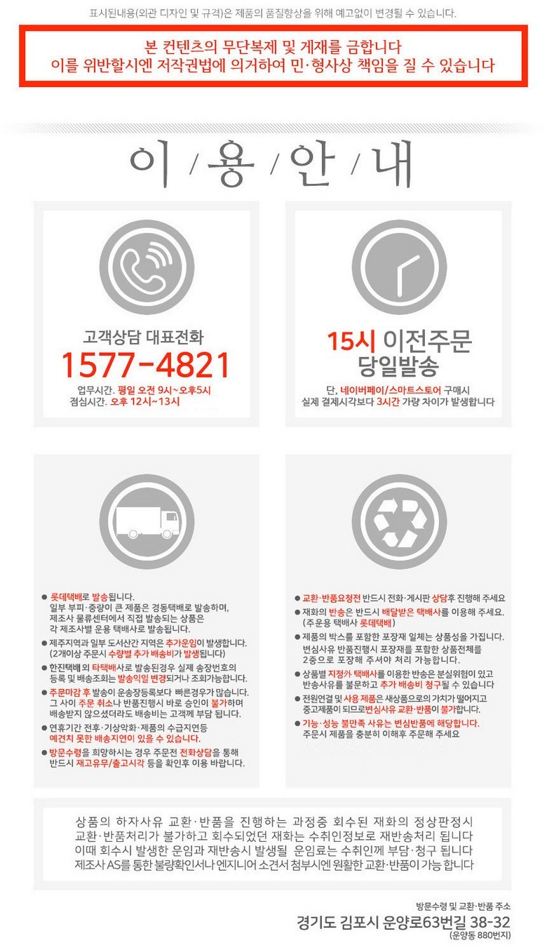 - ㆍ모니터 해상도의 차이로 인해 색상이나 이미지가 실제와 달라, 고객이 단순 변심으로 교환/반품을 무료로 요청하는 경우