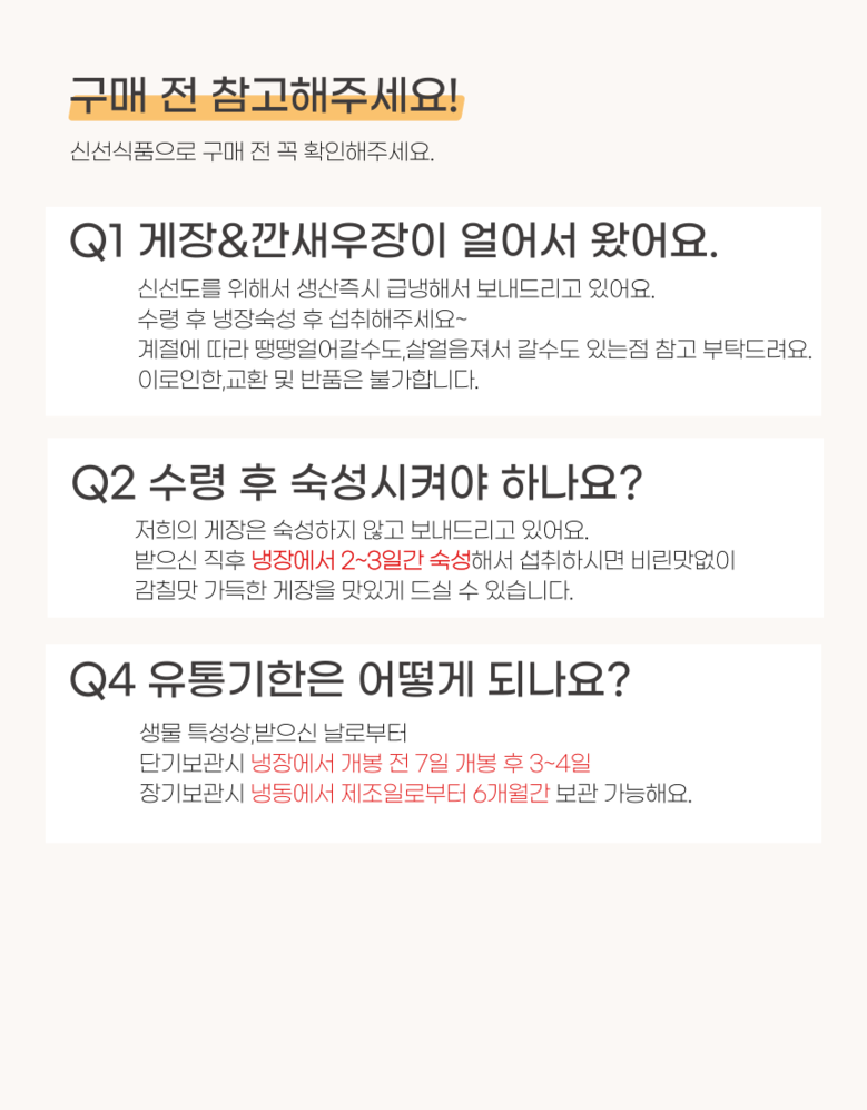 | 계절상품/식품/화장품 | ㆍ신선/냉장/냉동 상품의 단순변심의 경우 ㆍ뷰티 상품 이용 시 트러블(알러지, 붉은 반점, 가려움, 따가움)이 발생하는 경우, |