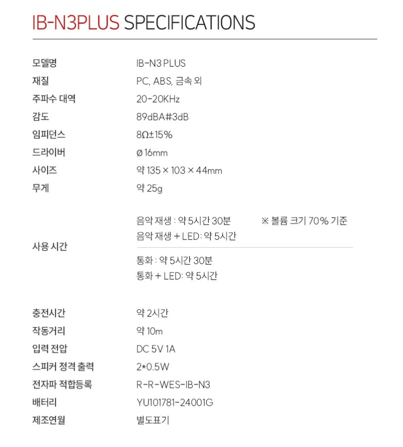 | 품명 및 모델명 | 블루투스 골전도 이어폰 / IB-N3 Plus | KC 인증정보 | 본품: R-R-WES-IB-N3 / 전지: YU101781-24001G |