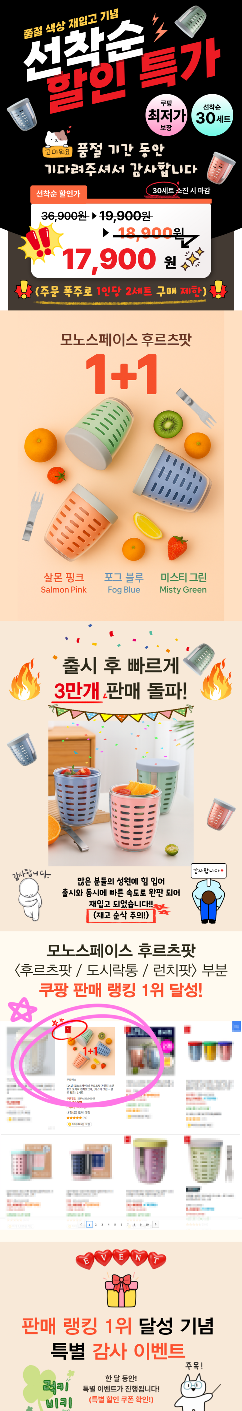 | 품명 및 모델명 | 모노스페이스 후르츠팟 | 재질 | PP, PET, 고무제(실리콘), 스테인리스 스틸 |
