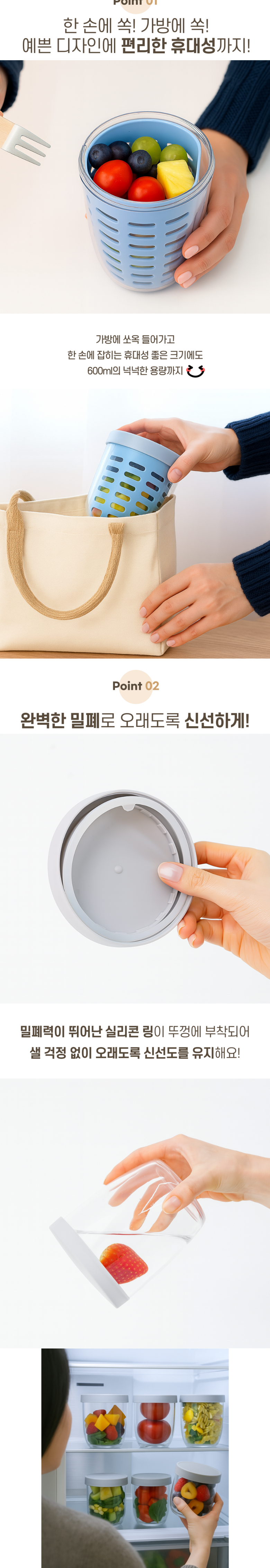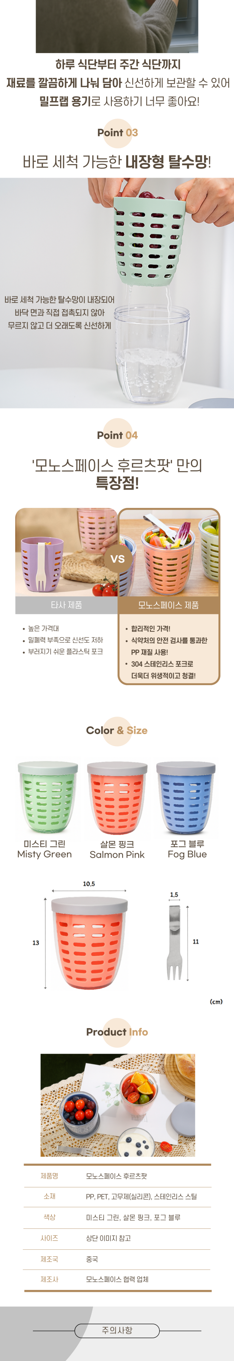 | 구성품 | 후르츠팟, 탈수망, 뚜껑, 304 스테인리스 포크 | 크기 | 본품(cm) : 10.5 x 13 / 포크 : 1.5 x 11 |