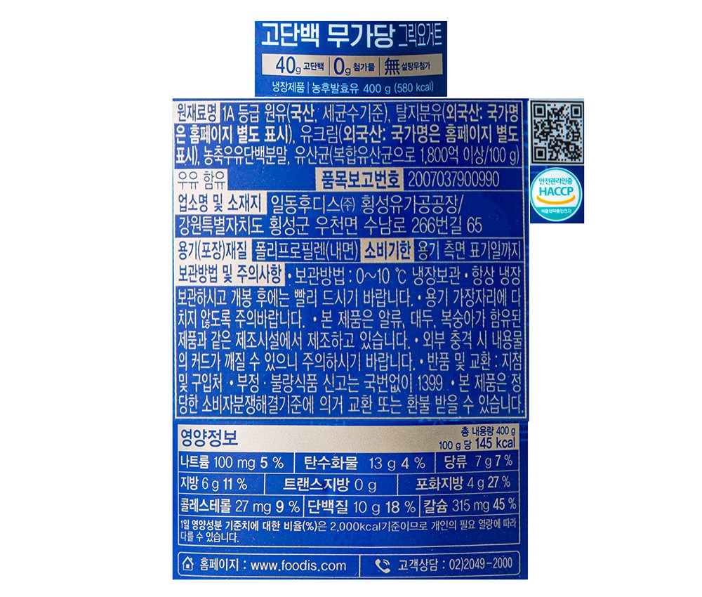 | 제품명 | 후디스 고단백 무가당 그릭요거트 | 식품의 유형 | 농후발효유 |