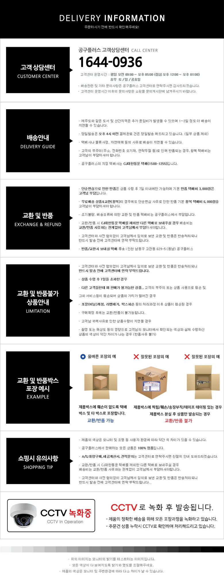 - ㆍ모니터 해상도의 차이로 인해 색상이나 이미지가 실제와 달라, 고객이 단순 변심으로 교환/반품을 무료로 요청하는 경우