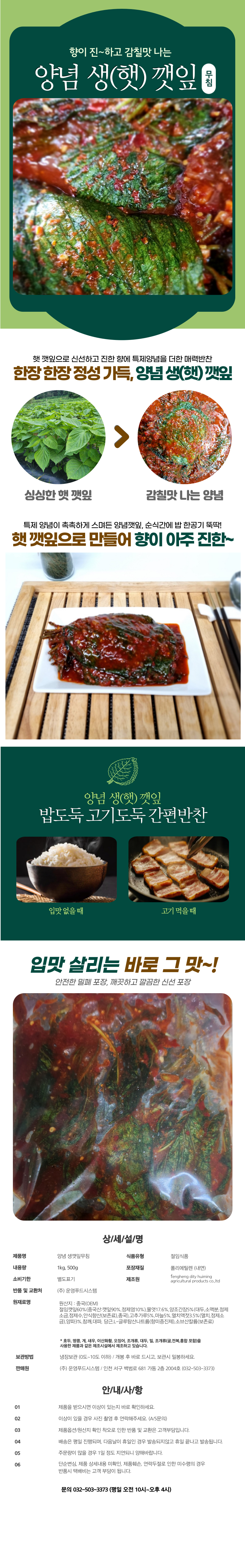 | 품목 또는 명칭 | 생깻잎(햇) 무침 | 포장단위별 내용물의 용량(중량),수량,크기 | 상품 상세페이지 참조 |