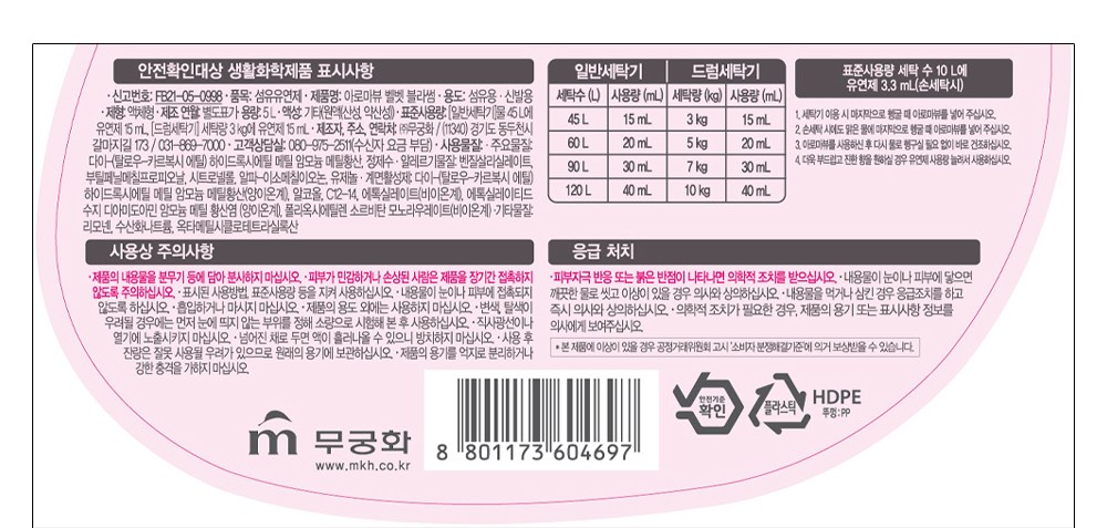| 품목 및 제품명 | 섬유유연제 / 아로마뷰 벨벳 블라썸 | 용도(표백제의 경우 계열을 함께표시) 및 제형 | 섬유용, 신발용 / 액체형 |