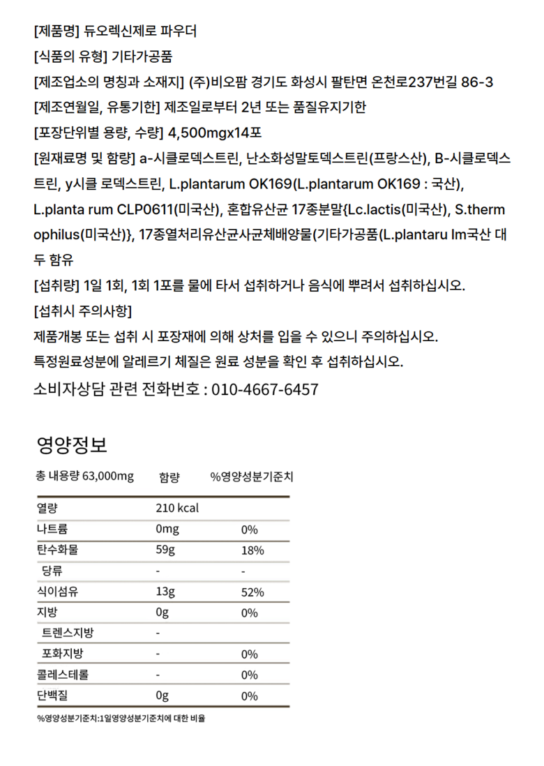 | 포장단위별 내용물의 용량(중량), 수량 | 4,500mgx14포 | 원재료명 및 함량 | a-시클로덱스트린, 난소화성말토덱스트린(프랑스산), B-시클로덱스 트린, y시클로덱스트린, L.plantarum OK169(L.plantarum OK169 : 국산), L.plantarum CLP0611(미국산), 혼합유산균 17종분말{Lc.lactis(미국산), S.therm ophilus(미국산)}, 17종열처리유산균사균체배양물(기타가공품(L.plantaru Im국산 대두 함유 |