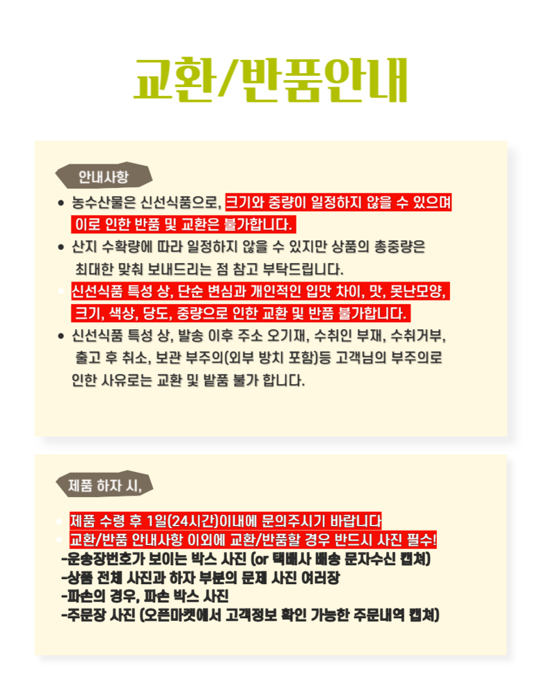 - ㆍ교환/반품에 관한 일반적인 사항은 판매자가 제시사항보다 관계법령이 우선합니다.