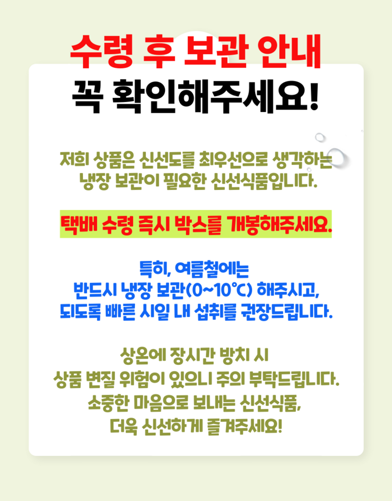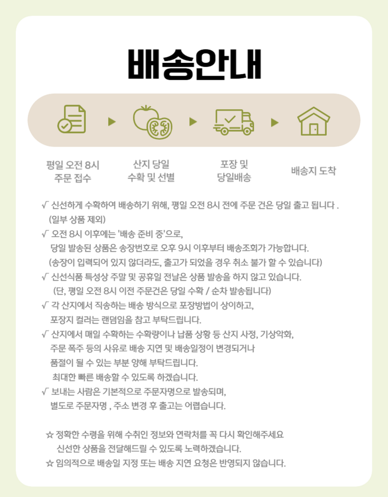 | 배송방법 | 신선/냉장/냉동 | 배송비 | 무료배송 - 도서산간 지역 배송불가 |