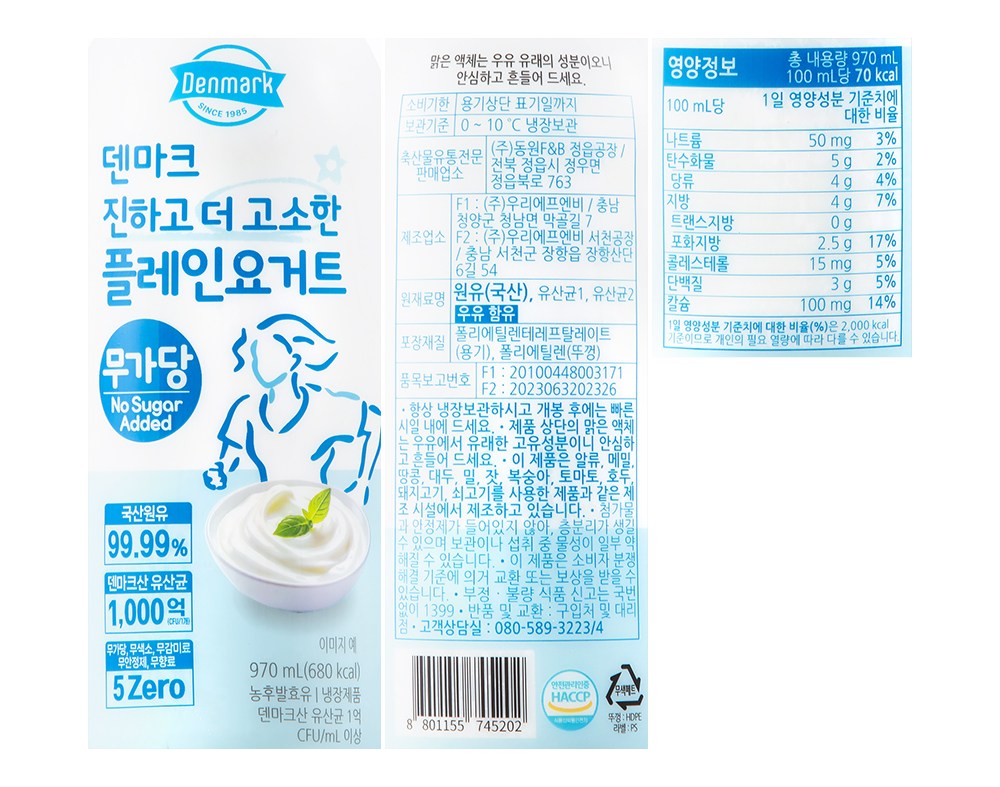 | 제품명 | 덴마크 진하고 더 고소한 무가당 플레인 요거트 | 식품의 유형 | 농후발효유 |