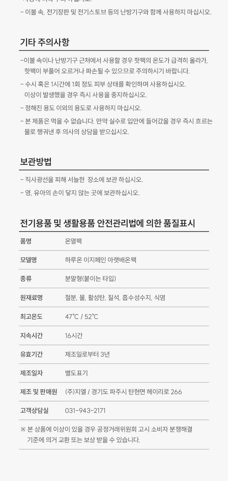 | 품명 및 모델명 | 하루온 이지페인 16h 편안한 따뜻함 | 인증/허가 사항 | B685H0005-25001 |