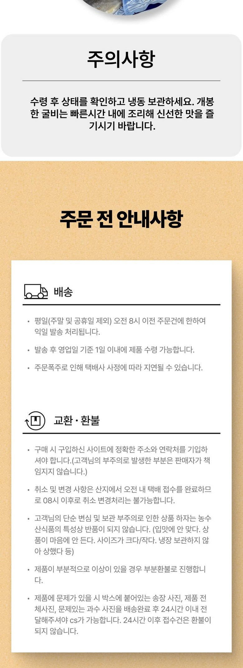 | 제조연월일, 소비기한 또는 품질유지기한 | 제조연월일 – 주문일로부터 3개월이내: 소비기한 – 냉동보관 시 제조일로부터 12개월 이내(※ 수령 후 가급적 빠른 섭취 권장) | 세부 품목군별 표시사항 | 수산물 / 건어물 / 굴비 (참조기) |