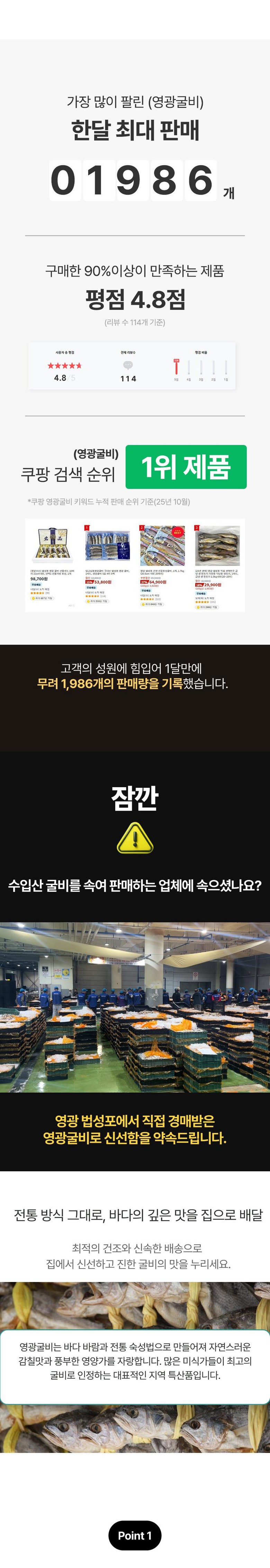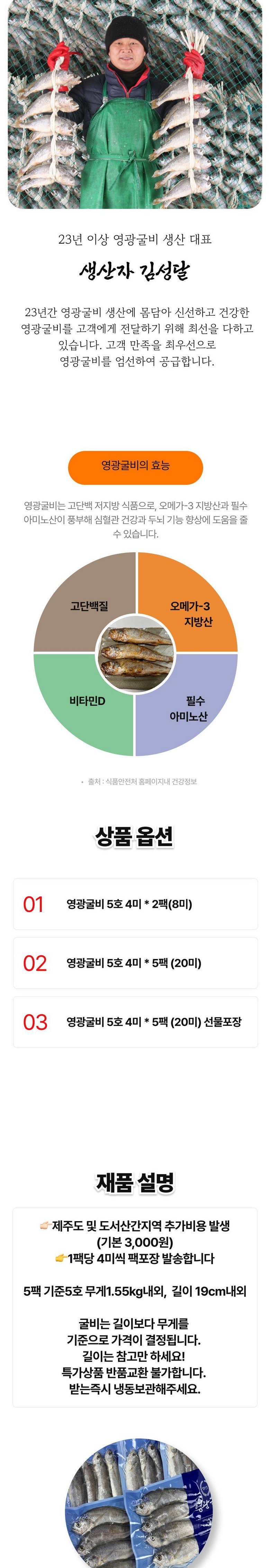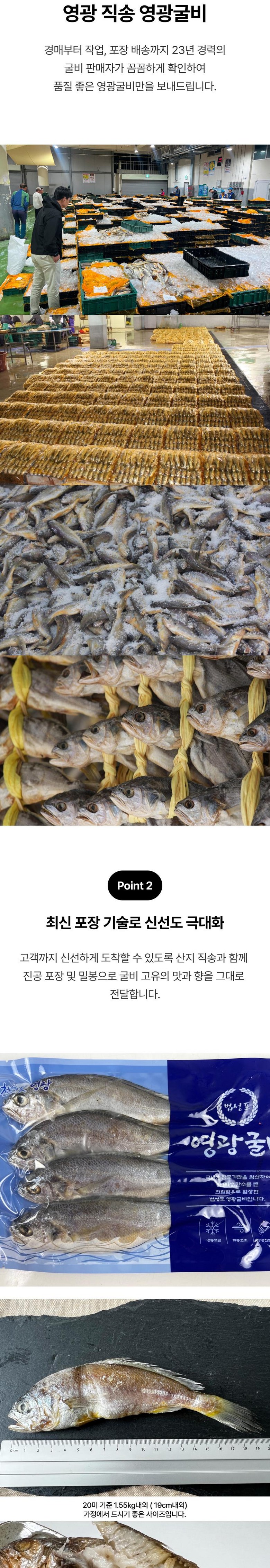| 품목 또는 명칭 | 영광굴비 (참조기) | 포장단위별 내용물의 용량(중량),수량,크기 | 1.5kg 내외 (20미기준) / 개당 길이 약 19cm 내외(※ 자연식품 특성상 크기·중량 편차 ±10% 내외 발생 가능) |