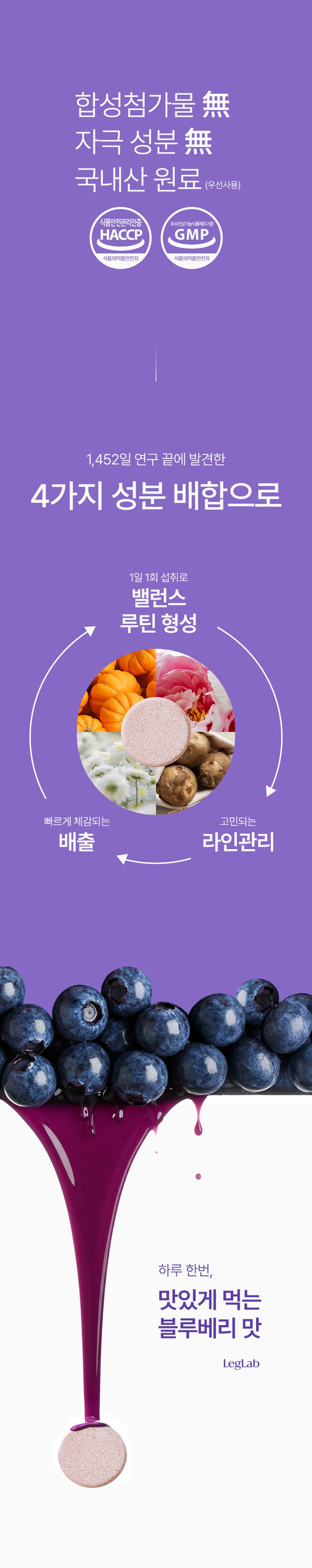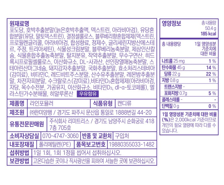 | 포장단위별 내용물의 용량(중량), 수량 | 1박스 (28정) | 원재료명 및 함량 | 포도당, 호박추출분말(늙은호박추출액, 덱스트린, 아라비아검), 유당혼합분말(유당, 말토덱스트린), 결정셀룰로스, 블루베리향혼합제제(덱스트린, 프로필렌글리콜, 아라비아검, 합성향료, 정제수, 글리세린지방산에스테르, 주정, 트리아세틴), 식물성크림분말, 블루베리농축분말, 제삼인산칼슘, 식물혼합추출농축분말, 탈지분유, 작약추출분말, 무수구연산, 히드록시프로필셀룰로스, 이산화규소, DL-사과산, 선인장열매농축분말, 스테아린산마그네슘, 돼지감자추출분말, 국화추출분말, 효소처리스테비아(감미료), 비타민C, 레드비트주스분말, 산수유추출분말, 레몬밤추출분말, 차전자피분말, 수크랄로스(감미료), 비타민D3혼합제제(아라비아검, 자당, 옥수수전분, 가공유지, 이산화규소, 비타민D3, dl-a-토코페롤), 엘라스틴가수분해물, 히알루론산 |
