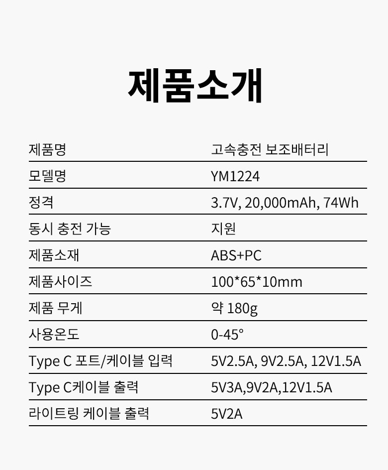 | 품명 및 모델명 | YM1224 보조배터리 | KC 인증정보 | YU10903-21003A |