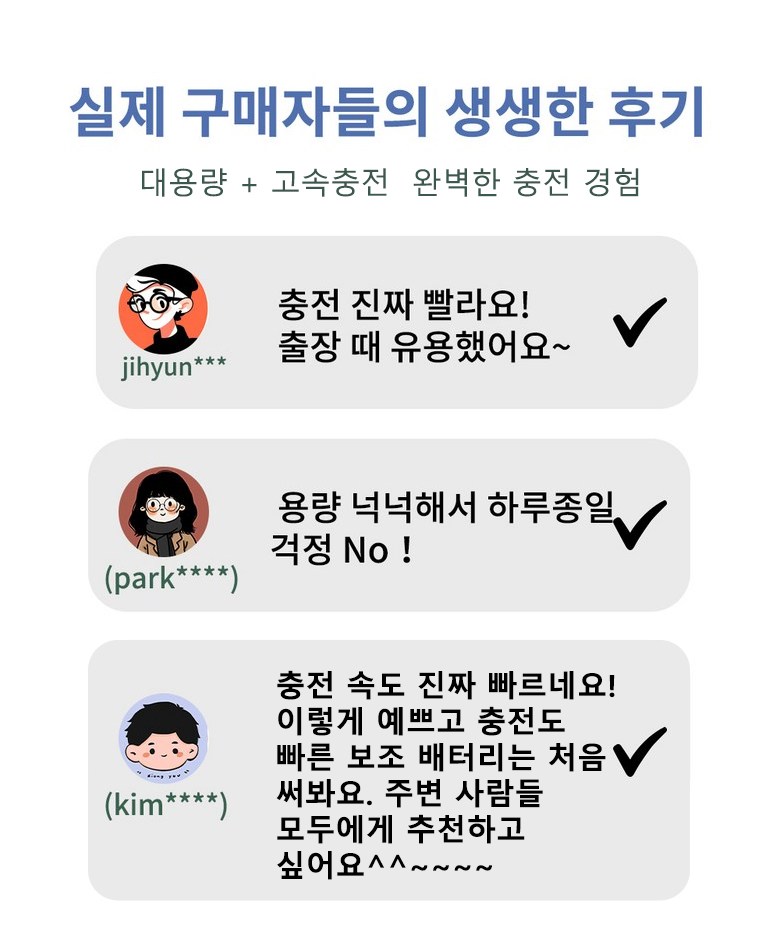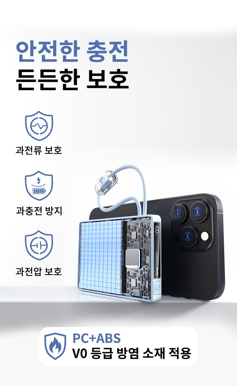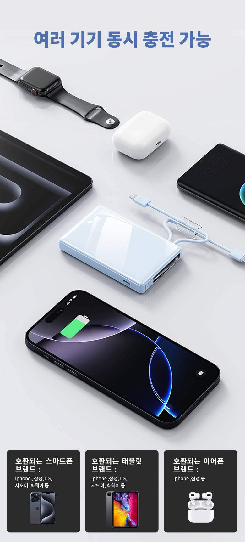 - 장기간 사용하지 않을 때는 휴대용 충전기 잔량을 **50%~70%**로 유지한 후 보관하고, 건조하고 서늘하며 통풍이 잘되는 곳에 두세요. 고온、습기 많은 환경、강자기장 환경(냉장고、전자레인지、자석 근처)에서는 멀리하세요.