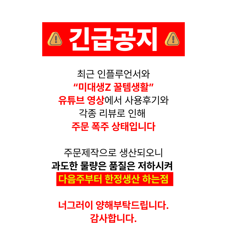 - ㆍ모니터 해상도의 차이로 인해 색상이나 이미지가 실제와 달라, 고객이 단순 변심으로 교환/반품을 무료로 요청하는 경우