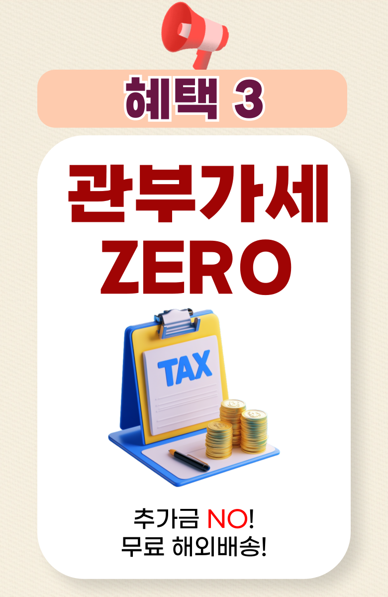 - 주문일 기준 동일 판매자 총 구매 금액이 면세 한도 초과 시 관부가세가 부과될 수 있습니다.