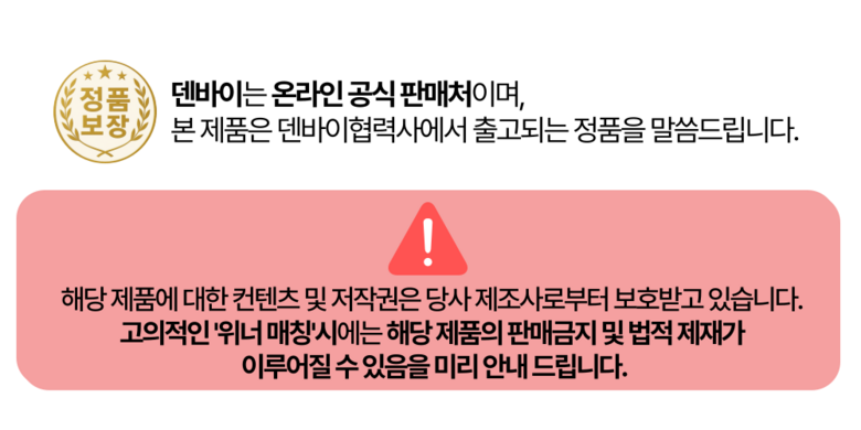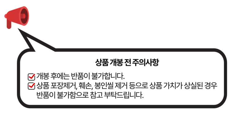 | 교환/반품 신청 기준일 | ㆍ단순변심에 의한 교환/반품은 제품 수령 후 7일 이내까지, 교환/반품 제한사항에 해당하지 않는 경우에만 가능 (배송비용과 교환/반품 비용 왕복배송비 고객부담) ㆍ상품의 내용이 표시·광고의 내용과 다른 경우에는 상품을 수령한 날부터 3개월 이내, 그 사실을 안 날 또는 알 수 있었던 날부터 |