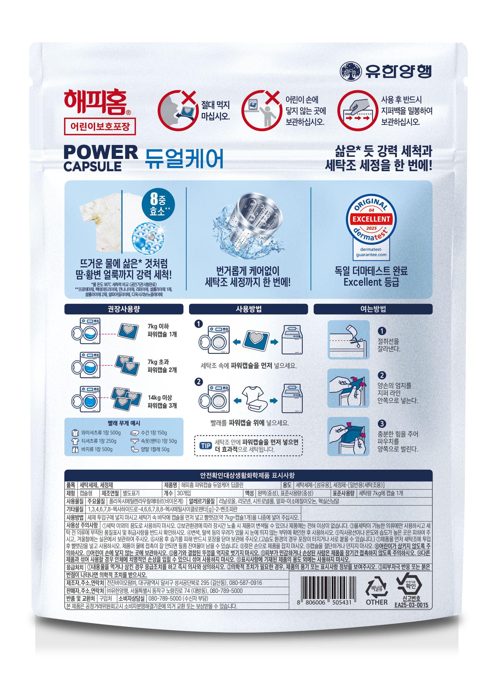 | 품목 및 제품명 | 세탁세제, 세정제 / 해피홈 파워캡슐 듀얼케어 딥클린 | 용도(표백제의 경우 계열을 함께표시) 및 제형 | 세탁세제 : 섬유용, 세정제 : 일반용(세탁조용) / 캡슐형 |