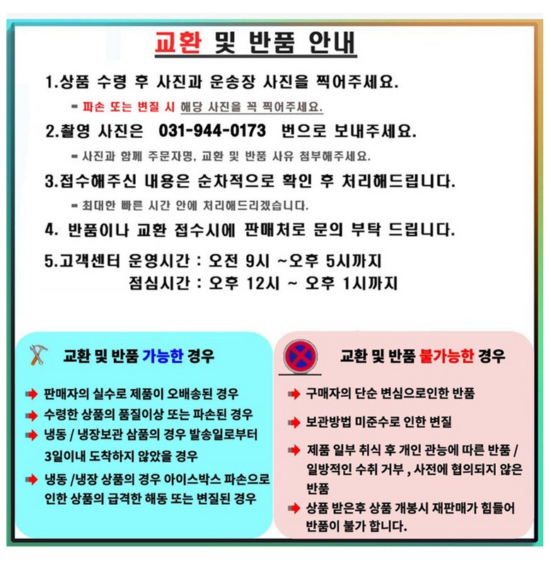- ㆍ교환/반품에 관한 일반적인 사항은 판매자가 제시사항보다 관계법령이 우선합니다.