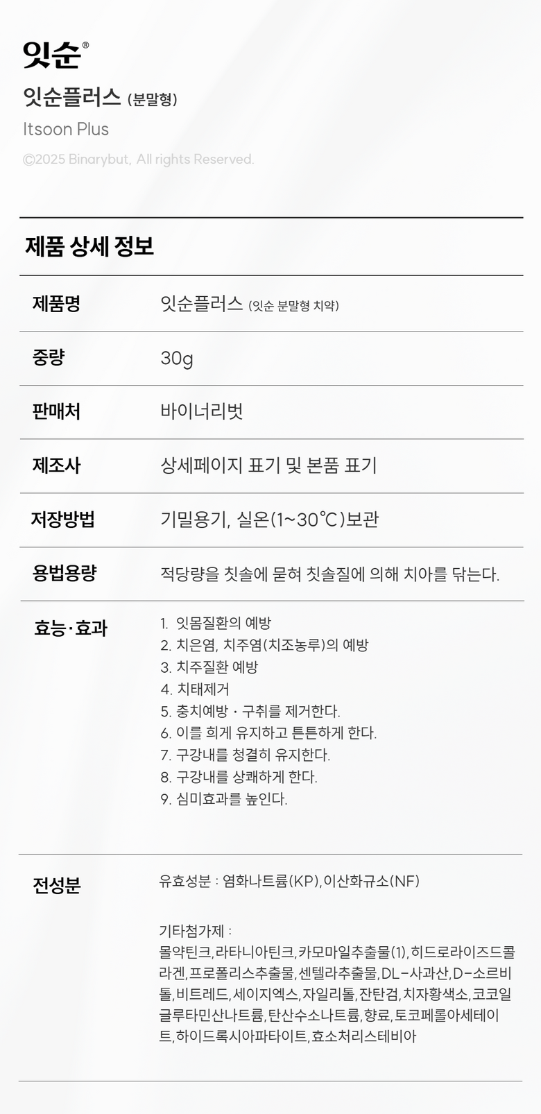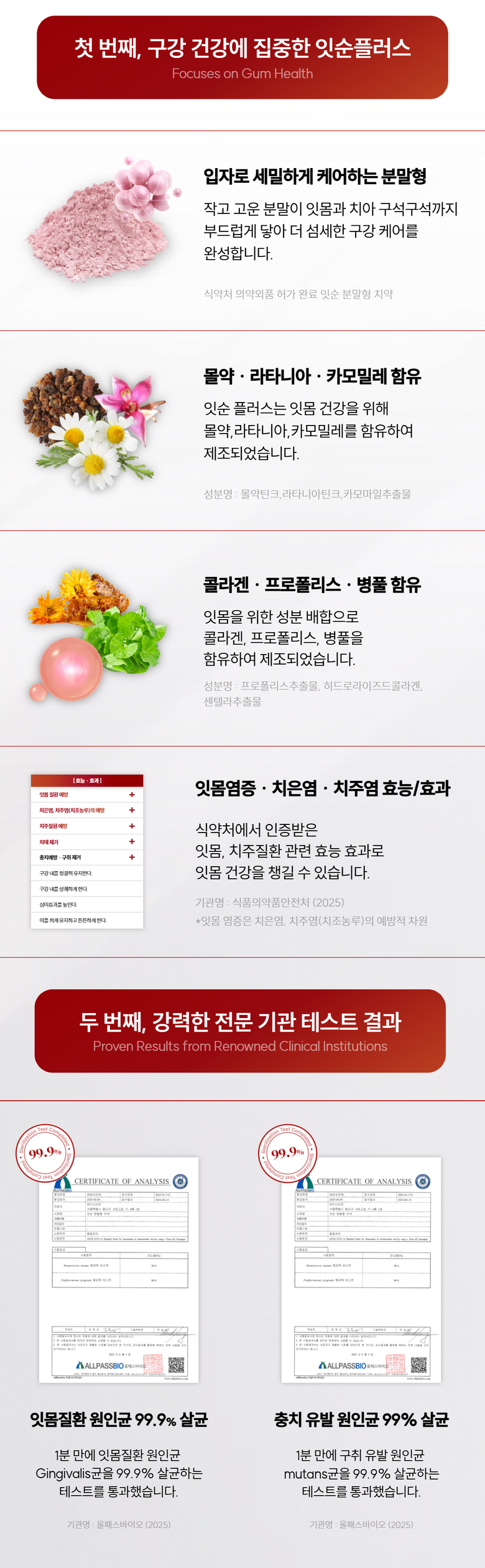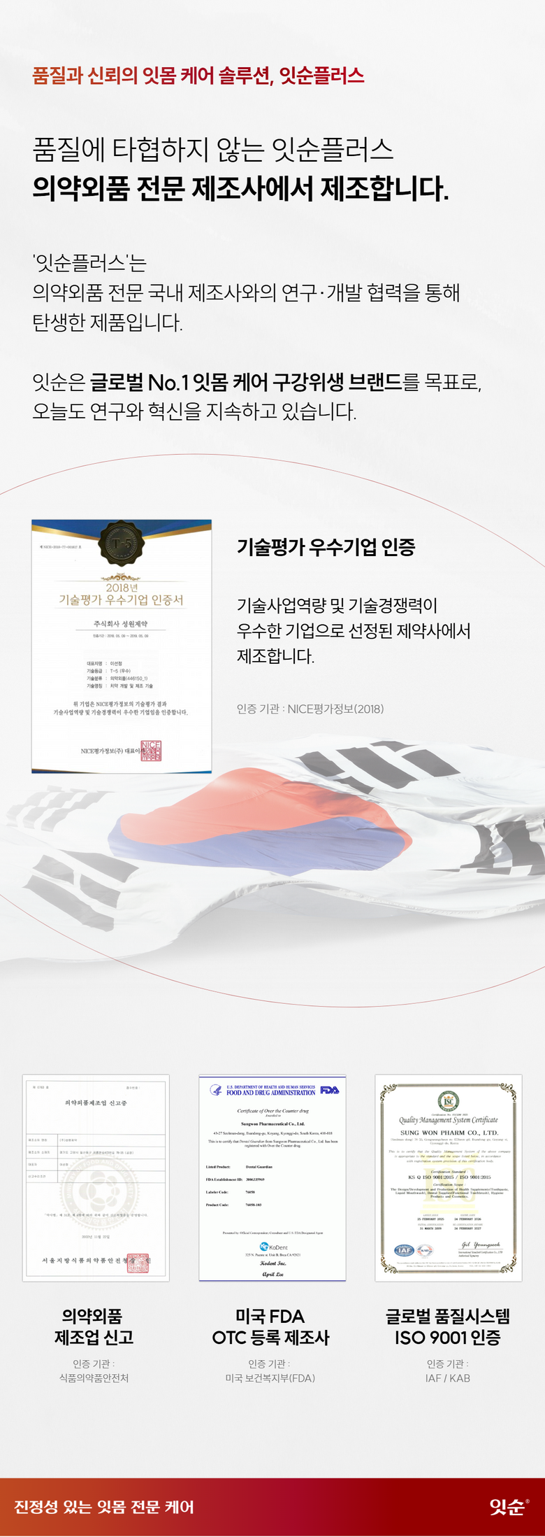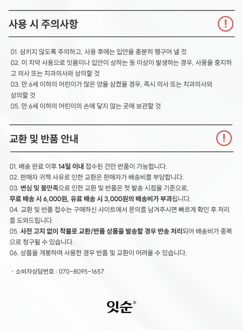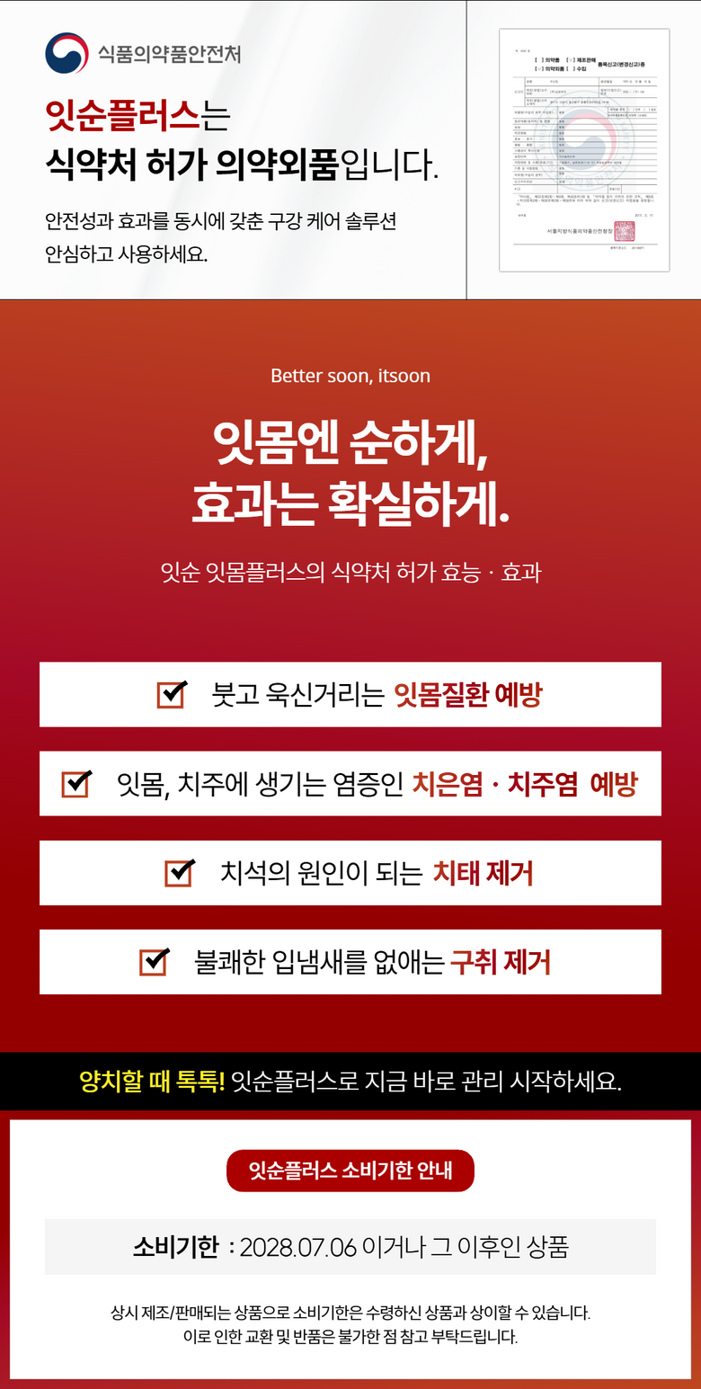 | 품명 및 모델명 | 잇순 잇순플러스 분말형 | 인증/허가 사항 | 의약외품 |
