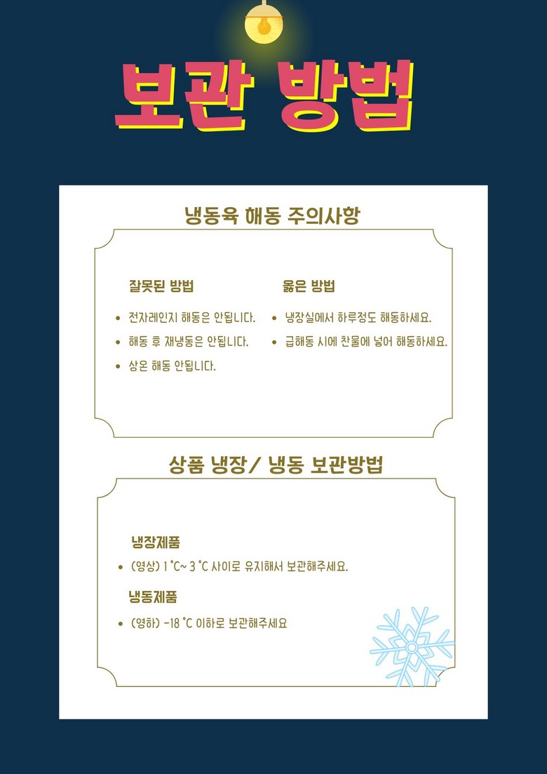 | 배송방법 | 신선/냉장/냉동 | 배송비 | 무료배송 · 도서산간 추가 배송비 - 제주 지역: 8,000원 - 도서산간 지역: 8,000원 |