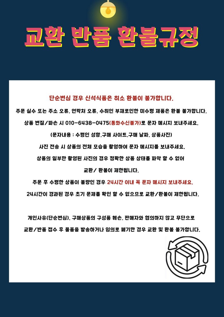 - ㆍ교환/반품에 관한 일반적인 사항은 판매자가 제시사항보다 관계법령이 우선합니다.