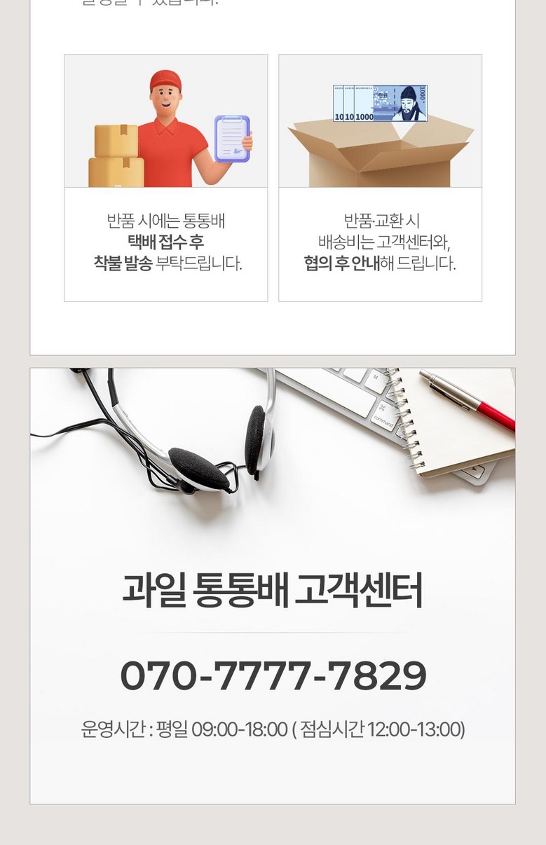 - ㆍ모니터 해상도의 차이로 인해 색상이나 이미지가 실제와 달라, 고객이 단순 변심으로 교환/반품을 무료로 요청하는 경우