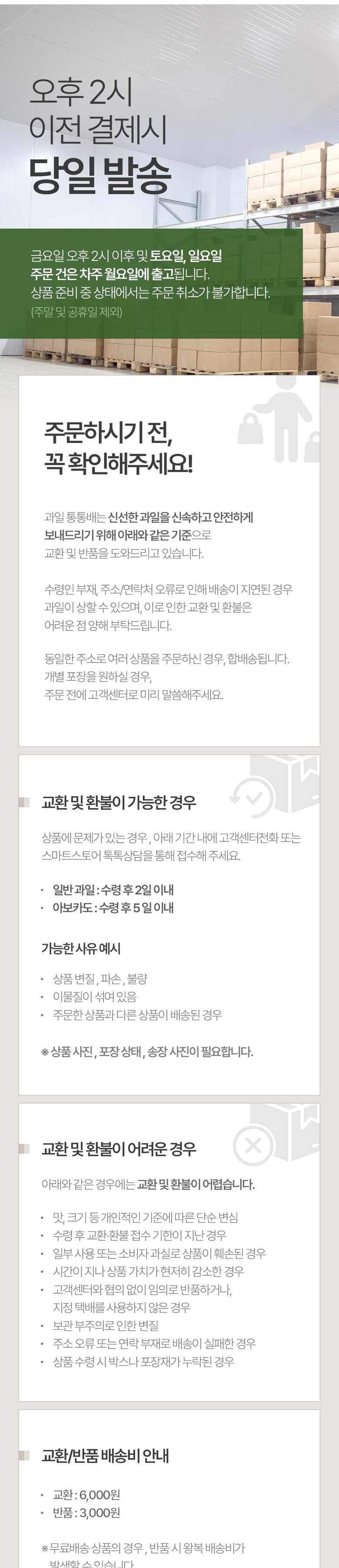 | 배송방법 | 신선/냉장/냉동 | 배송비 | 무료배송 · 도서산간 추가 배송비 - 제주 지역: 3,000원 - 도서산간 지역: 5,000원 |