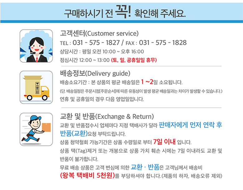 - ㆍ모니터 해상도의 차이로 인해 색상이나 이미지가 실제와 달라, 고객이 단순 변심으로 교환/반품을 무료로 요청하는 경우