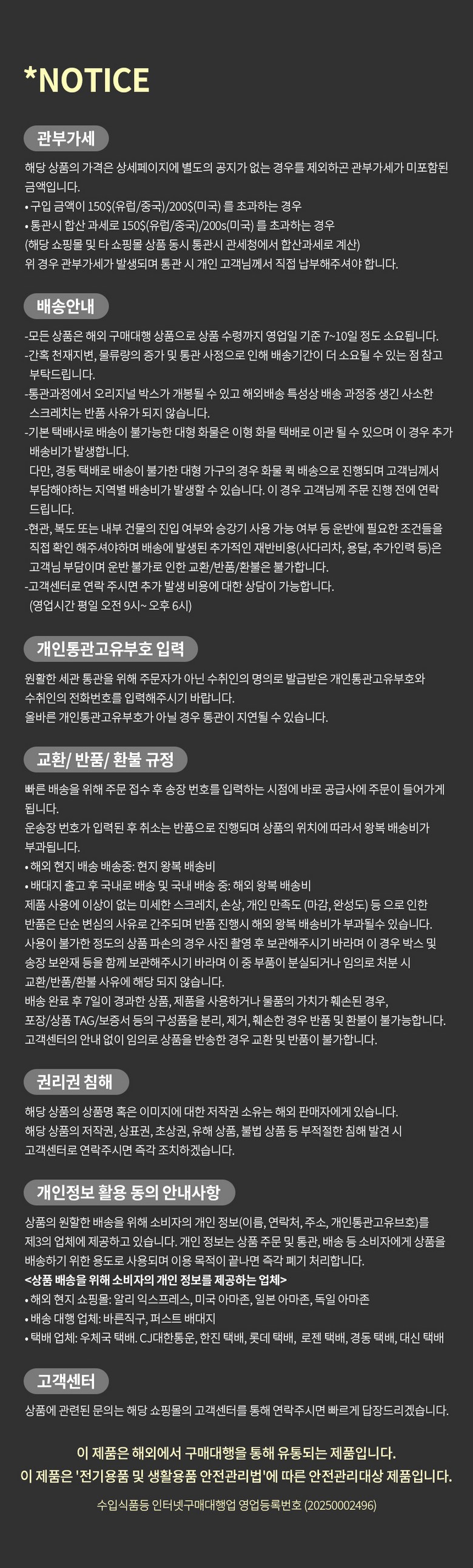 - 주문일 기준 동일 판매자 총 구매 금액이 면세 한도 초과 시 관부가세가 부과될 수 있습니다.