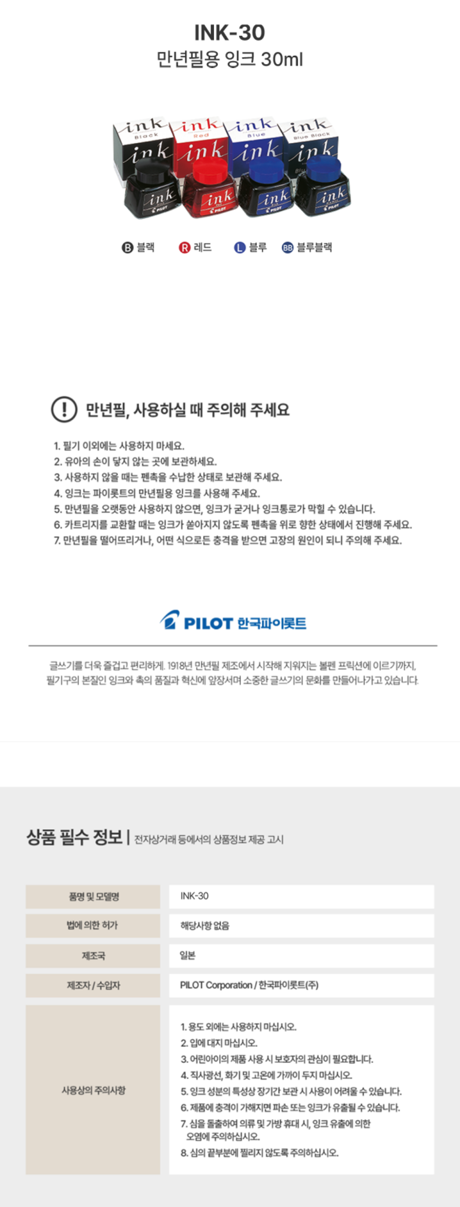 | 품명 및 모델명 | 파이롯트 만년필용 잉크 30ml | 인증/허가 사항 | 해당없음(14세이상) |