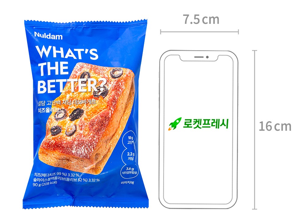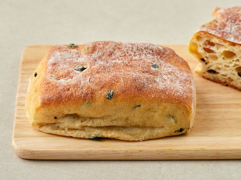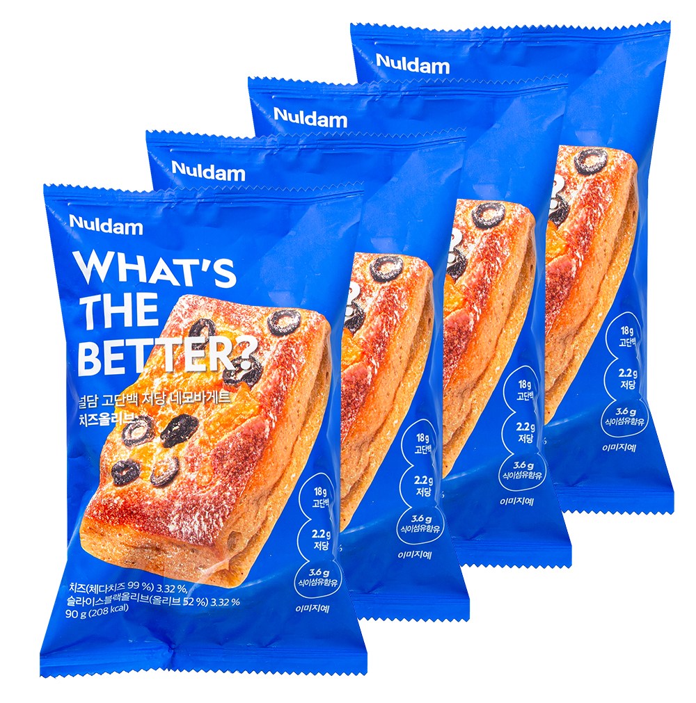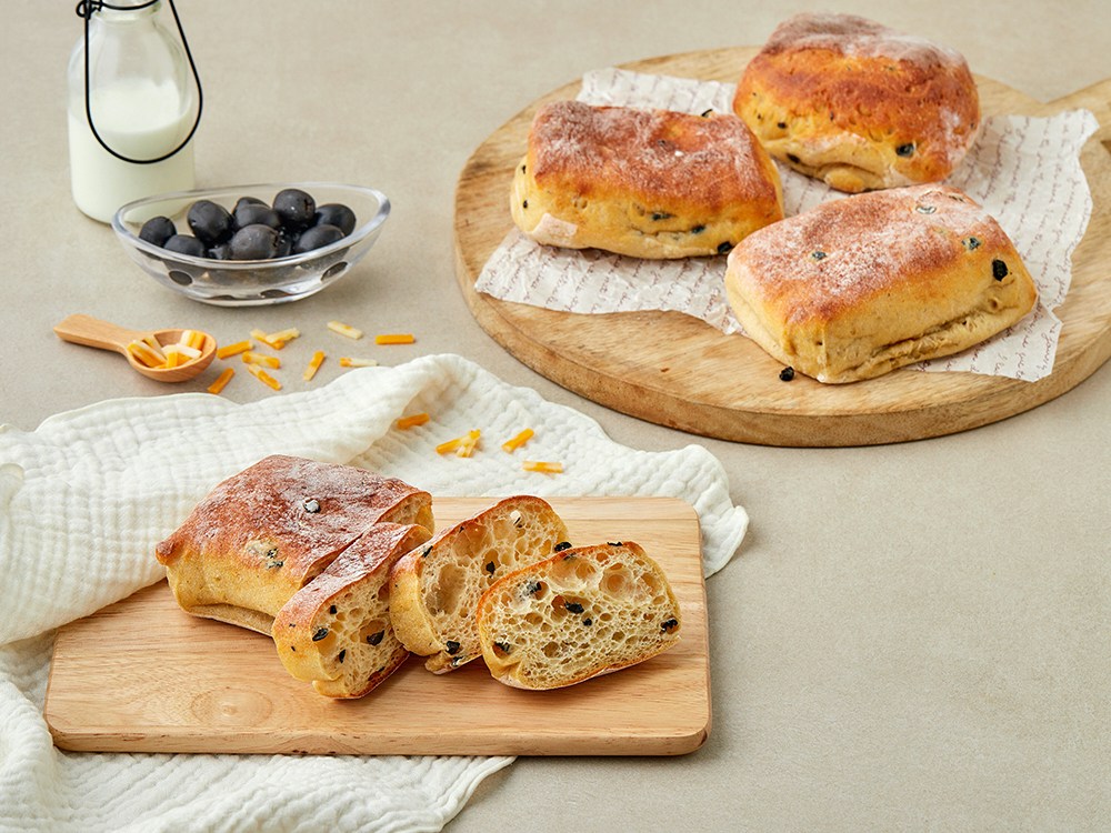 널담의 고단백 저당 치즈올리브 네모바게트예요. 마치 갓 구워낸 것처럼 겉은 바삭하면서 속은 쫄깃한 식감이 일품이지요. 치즈와 슬라이스 블랙올리브를 넣어 짭조름한 감칠맛도 더했답니다. 그대로 먹어도 맛있고, 반으로 갈라 샌드위치로 활용하셔도 좋아요.