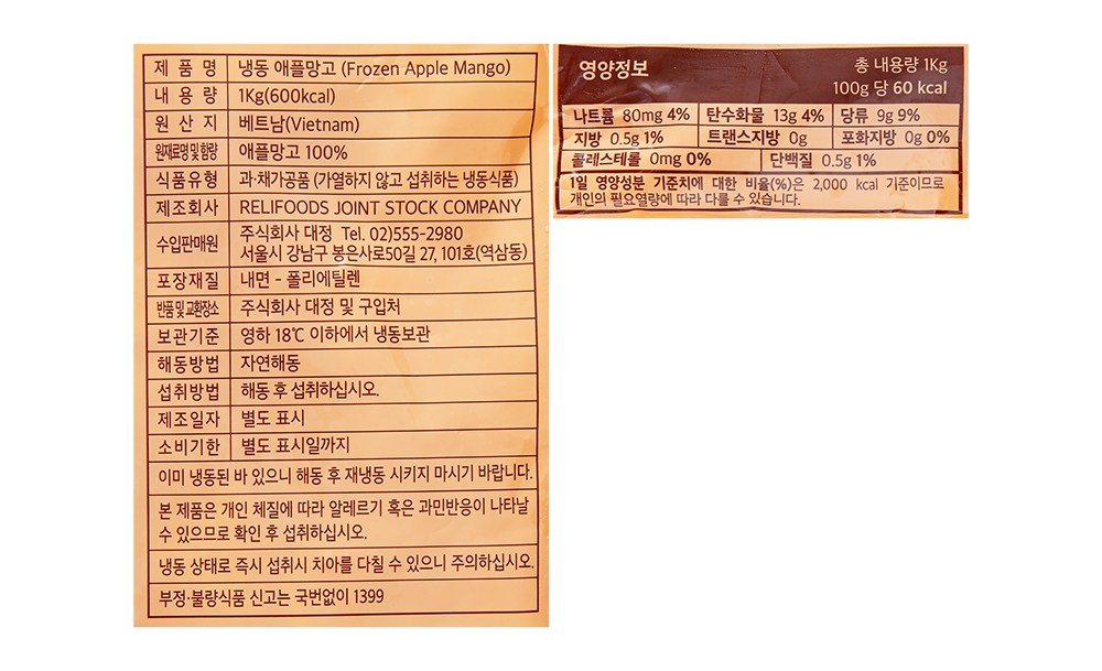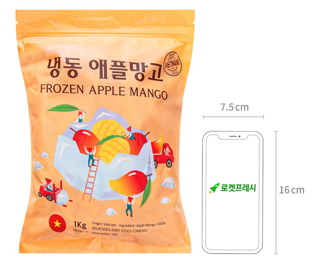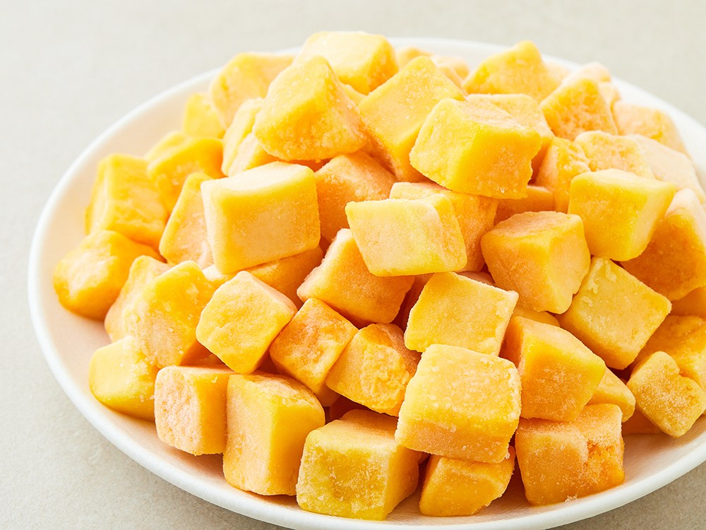 사과처럼 붉은 껍질을 제거하고 과육만 먹기 좋은 큐브 형태로 손질했어요. 샛노랗게 후숙된 망고 과육을 얼려 본연의 달콤한 과즙을 그대로 품고 있죠. 우유와 함께 갈아 시원한 스무디로 만들어도 맛있고, 빙수나 잼 재료로 활용해도 좋아요.