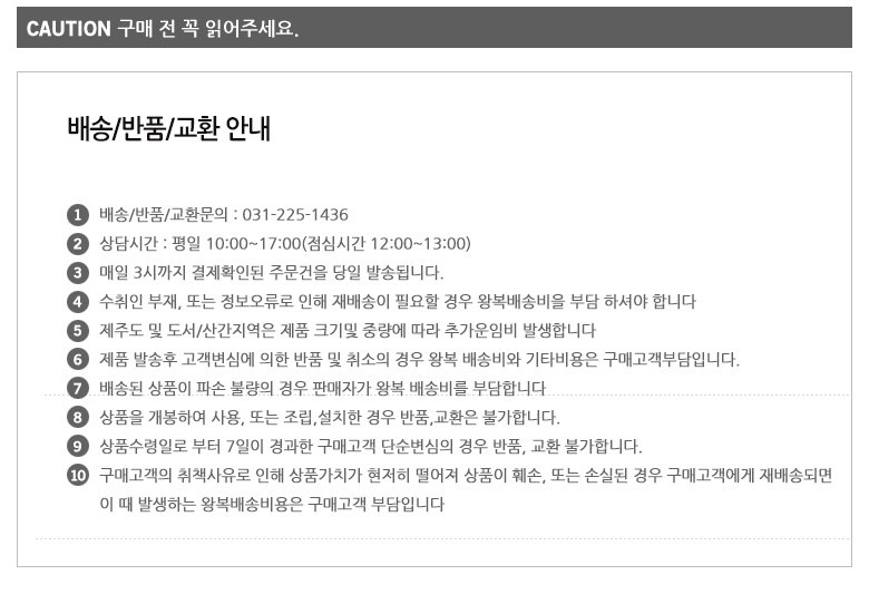 - ㆍ교환/반품에 관한 일반적인 사항은 판매자가 제시사항보다 관계법령이 우선합니다.