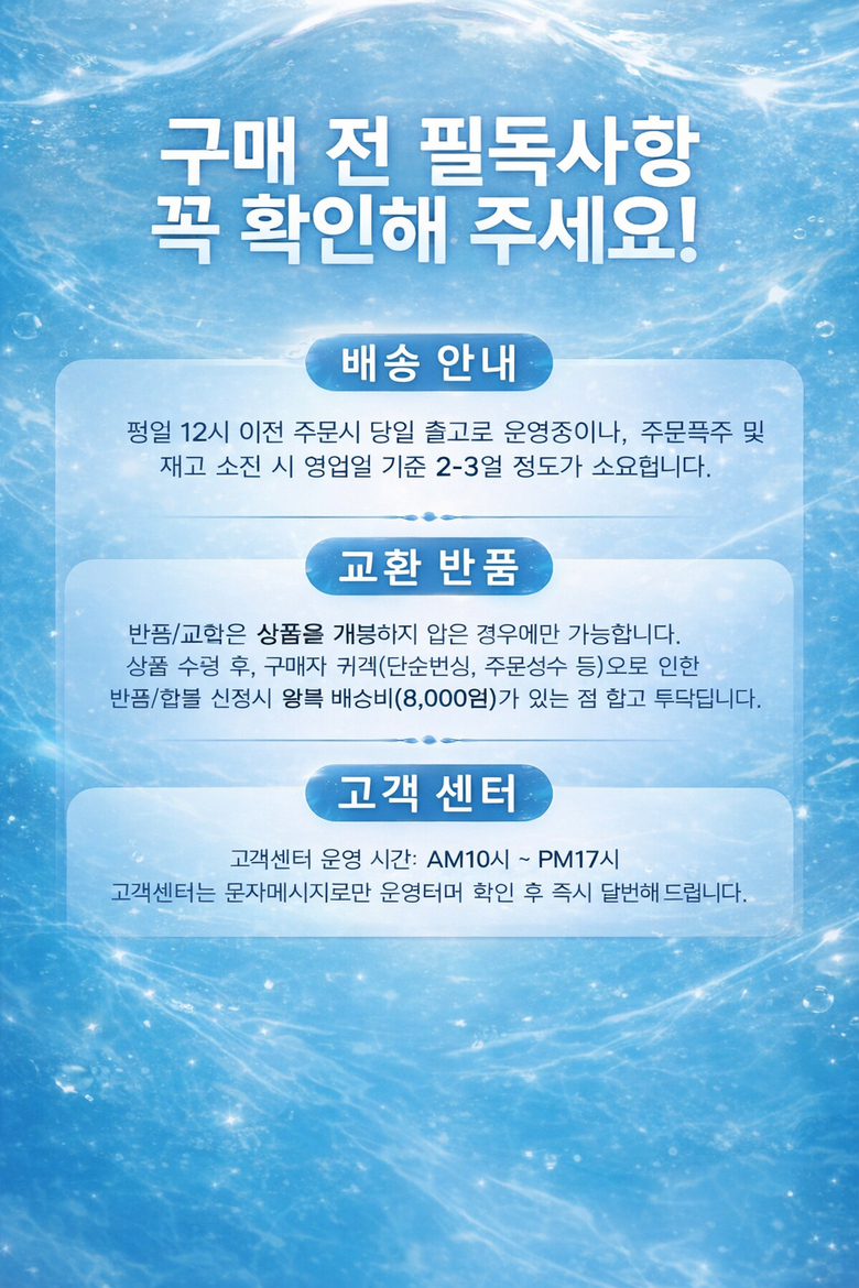 | 교환/반품 비용 (왕복비용) | 8,000원 - 단, 고객 변심의 경우에만 발생 - 도서산간 지역 배송불가 |