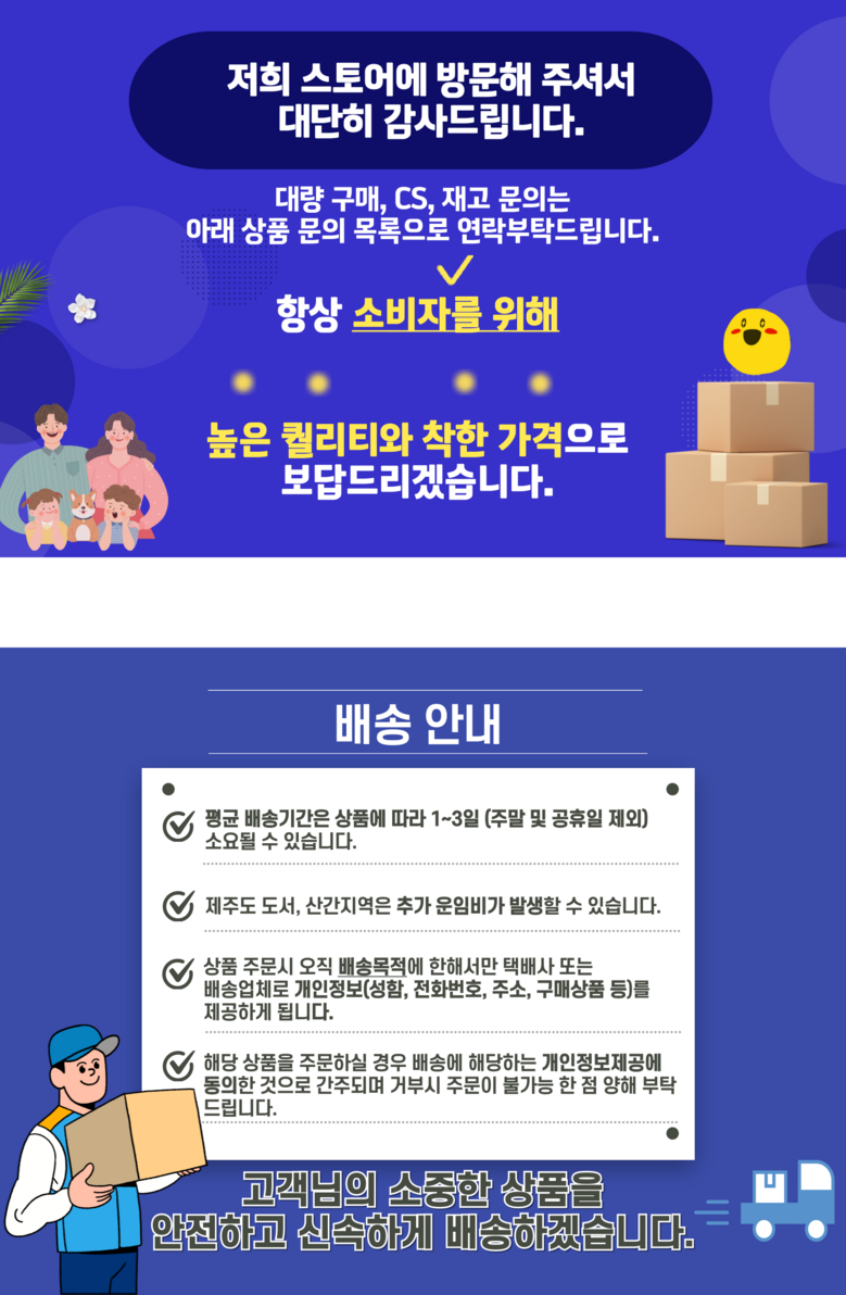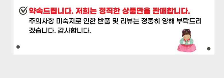 - ㆍ모니터 해상도의 차이로 인해 색상이나 이미지가 실제와 달라, 고객이 단순 변심으로 교환/반품을 무료로 요청하는 경우