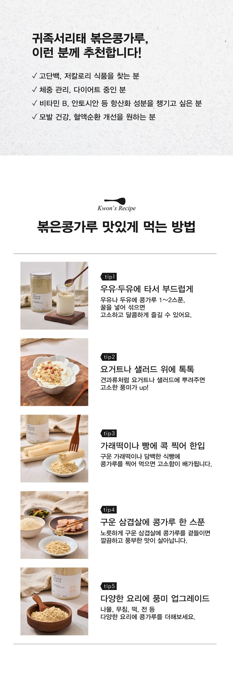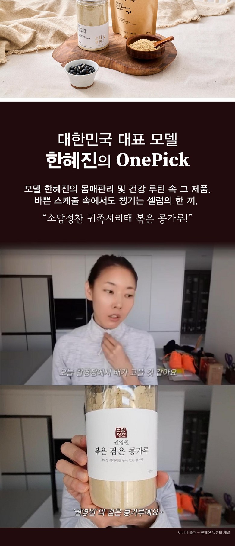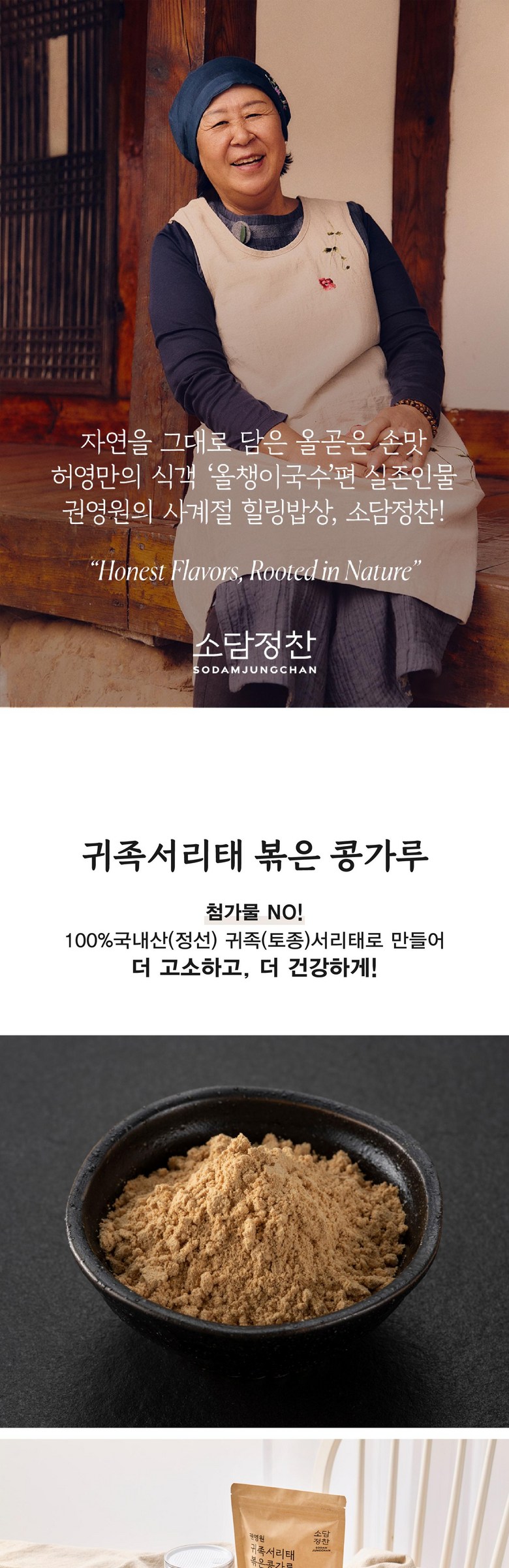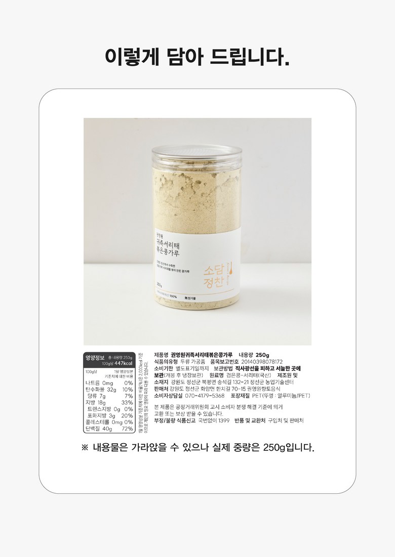 | 품목 또는 명칭 | [소담정찬] 권영원 귀족서리태 볶은검은콩가루 | 포장단위별 내용물의 용량(중량),수량,크기 | 250g |