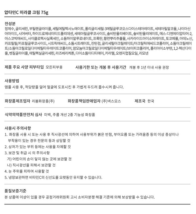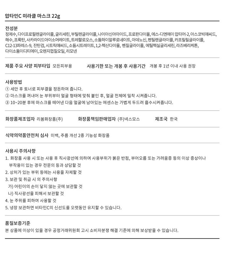 | 화장품제조업자, 화장품책임판매업자 및 맞춤형화장품판매업자 | 상품 상세페이지 참조 | 제조국 | 상품 상세페이지 참조 |