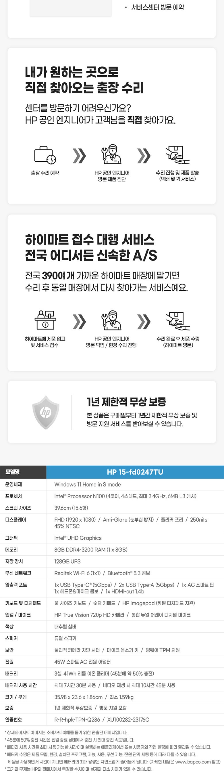 | 품명 및 모델명 | 노트북 컴퓨터 / 모델명 : HP 15-fd0247TU / 인증모델명 : TPN-Q286 | KC 인증정보 | XU100282-23176C, R-R-hpk-TPN-Q286 |