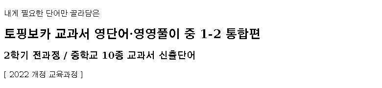 | 도서명 | 토핑보카 교과서 영단어·영영풀이 중 1-2 통합편 2학기 전과정 / 중학교 10종 교과서 신출단어 [ 2022 개정 교육과정 ] 영어 중등 1학년 | 저자, 출판사 | 김행필, 학문아카이브 |