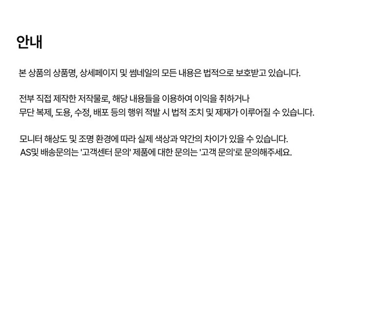 - ㆍ모니터 해상도의 차이로 인해 색상이나 이미지가 실제와 달라, 고객이 단순 변심으로 교환/반품을 무료로 요청하는 경우