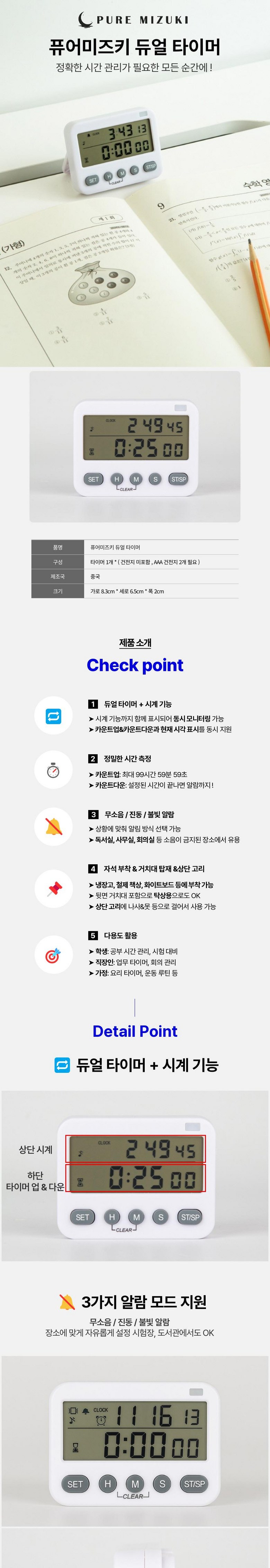 | 품명 및 모델명 | 퓨어미즈키 듀얼 스톱워치 순공 진동 무소음 수능 공부 쿠킹 타이머 | 인증/허가 사항 | 상품 상세페이지 참조 |