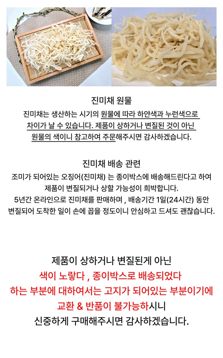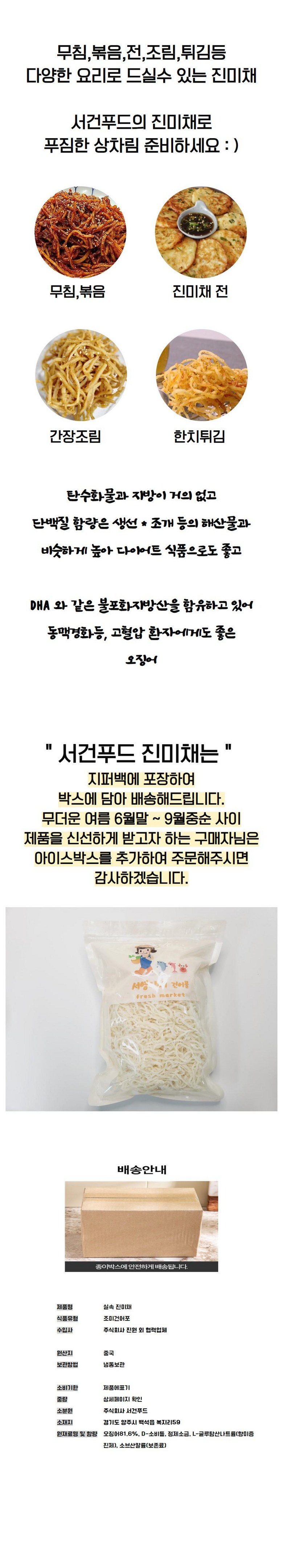 | 품목 또는 명칭 | 실속진미채 | 포장단위별 내용물의 용량(중량),수량,크기 | 상품 상세페이지 참조 |
