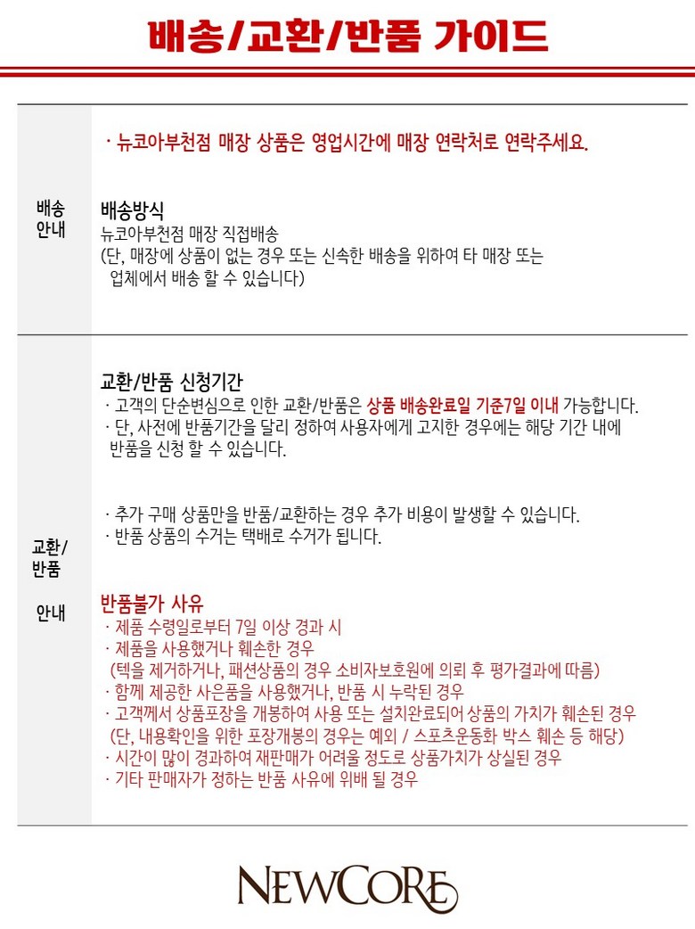 - ㆍ교환/반품에 관한 일반적인 사항은 판매자가 제시사항보다 관계법령이 우선합니다.
