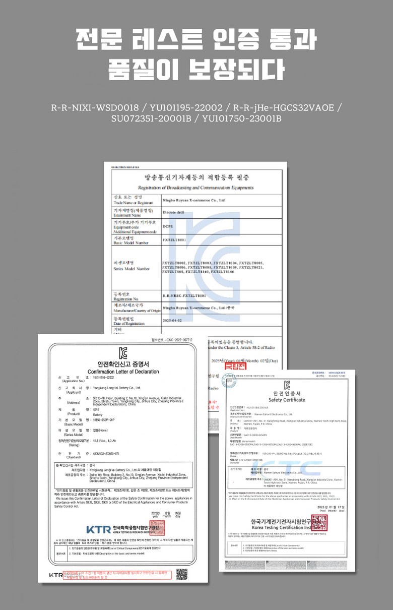 | 품명 및 모델명 | 품 명:전동공구 / 모델명:DR-001 | KC 인증정보 | R-R-NIXI-DR-001 / YU101195-22002 / R-R-jHe-HGCS32VAOE / SU072351-20001B / YU101750-23001B |