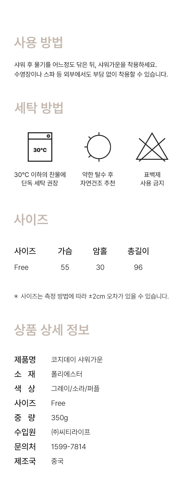 | 품명 및 모델명 | 공유 코지데이 여성 호텔 골프 샤워가운 목욕가운 | 인증/허가 사항 | 해당없음 |