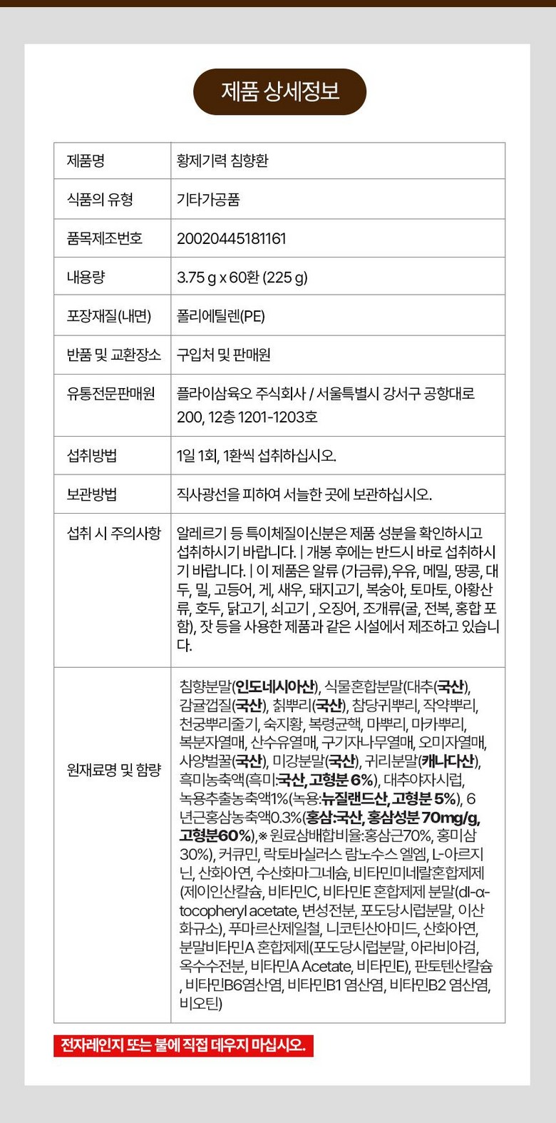 | 제품명 | 황제기력 침향환 | 식품의 유형 | 상품 상세페이지 참조 |